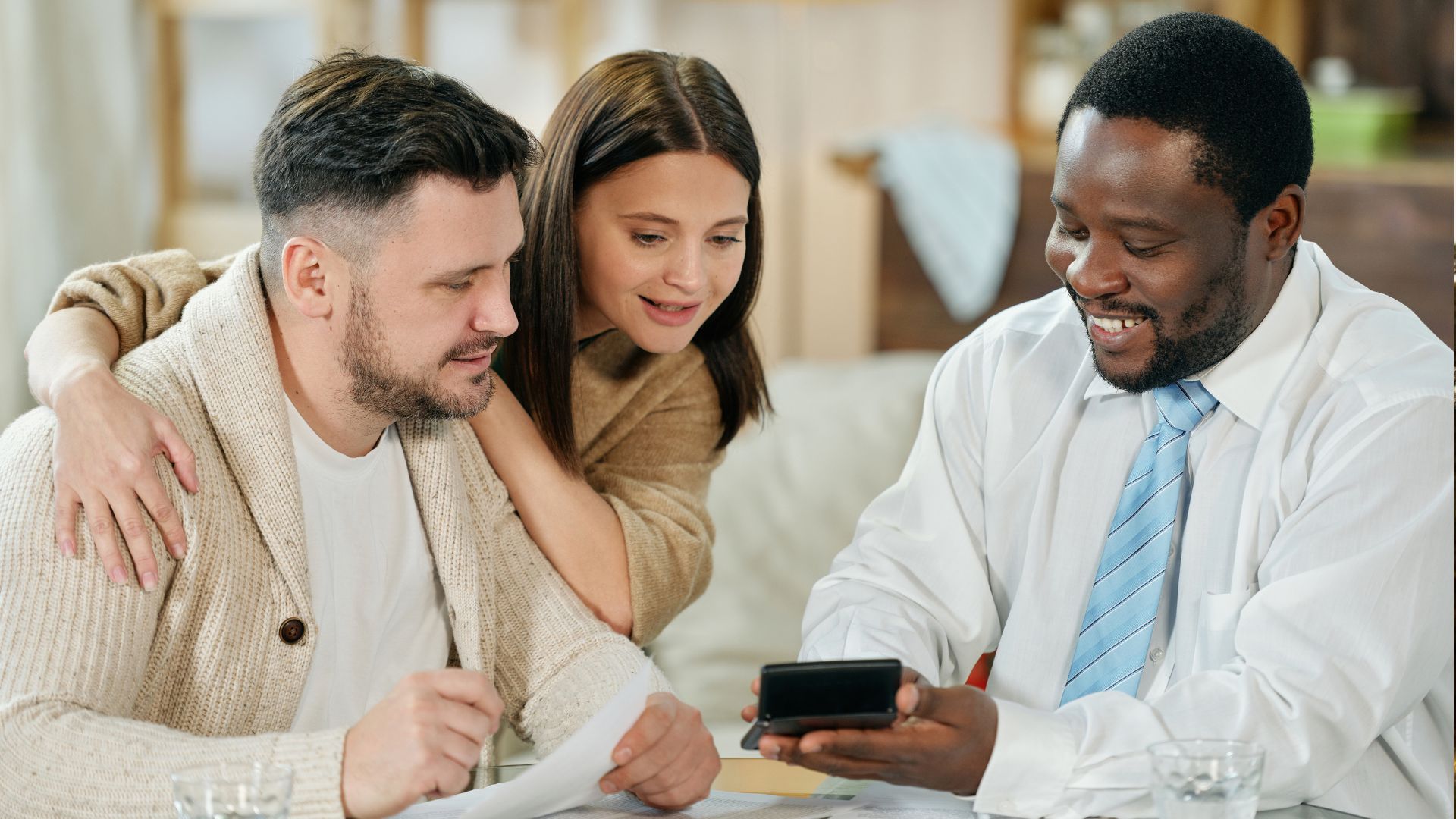 Content man advising young couple on home loan